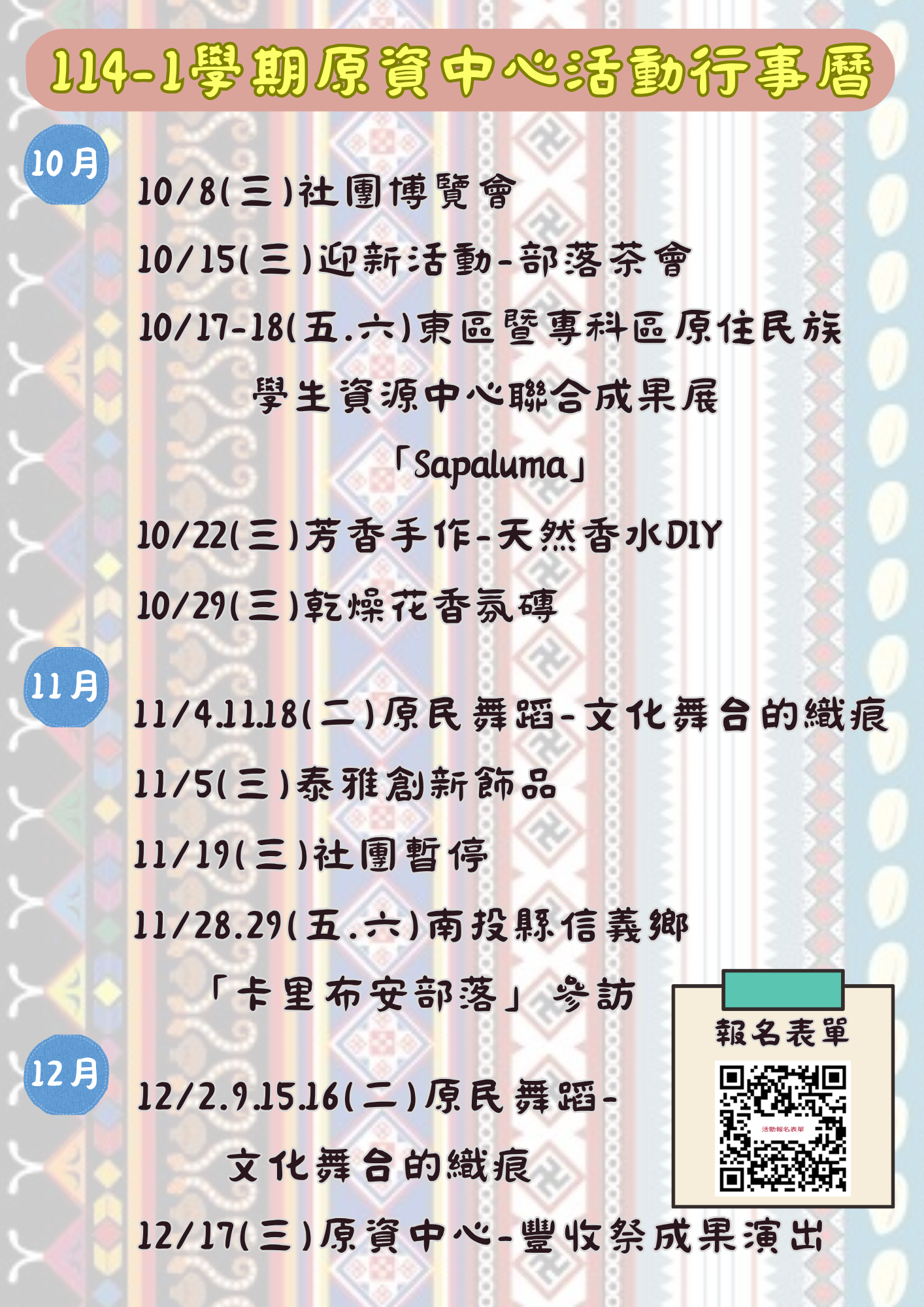 原住民族學生資源中心114學年度第1學期-活動行事曆,歡迎原住民族學生點閱查看。