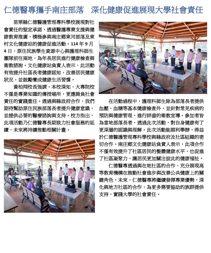 仁德醫專攜手南庄部落 深化健康促進展現大學社會責任